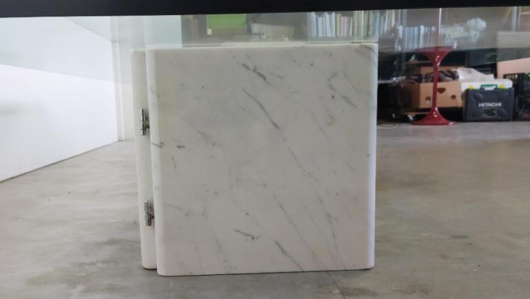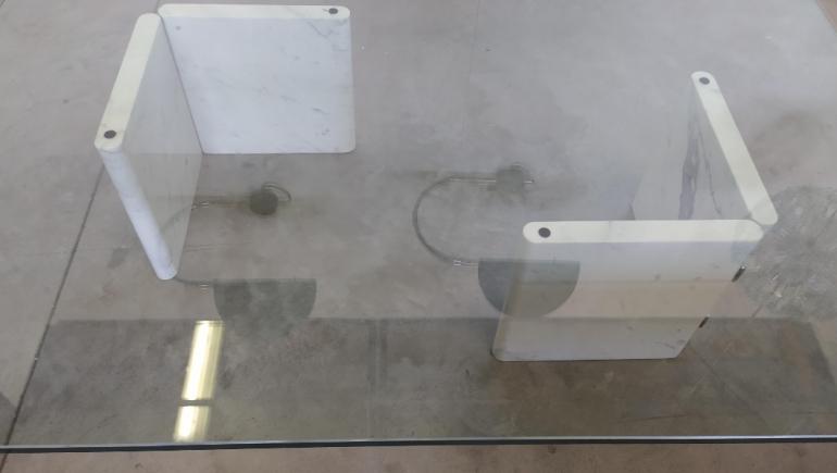 Coffee table con basi in marmo di Carrara bianco a libro, regolabili attraverso le cerniere in acciaio e parte superiore in vetro molato e temprato di forte spessore. Ideato da Massimo e Lella Vignelli, è stato prodotto da UP&UP nel 1980.