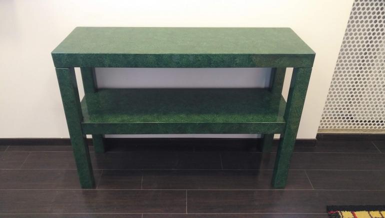 Tavolo console rivestita in pergamena colorata con finitura a poliestere , struttura a sezione quadrata con due piani rettangolari