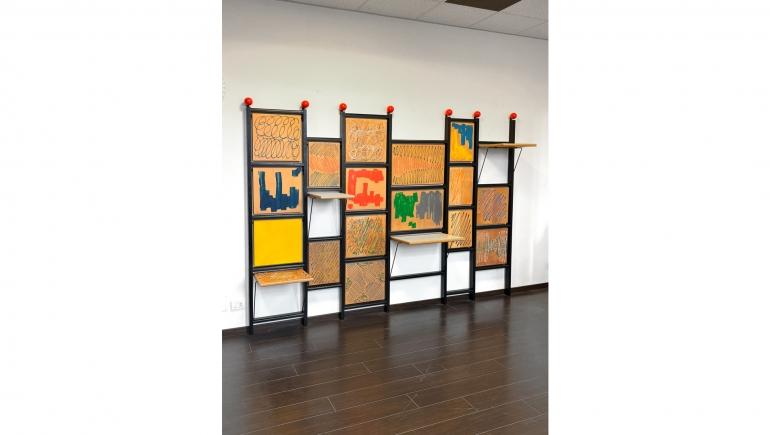 Libreria fa parte della collezione " Luigi ' o ' Mi Amate Voi ", Realizzata da Gaetano Pesce in diverse configurazioni, opera completa a sei moduli con tutti i pannelli dipinti dall'artista che sorretti dalle strutture in ferro ad U diventano i piani della libreria.